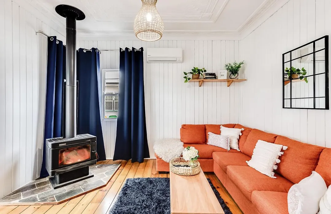 Ein Patio und eine Sitzecke der Cheerful, Cosy Cottage - Near Rose Garden!, ausgestattet mit einem Flachbildfernseher mit Satellitenkanälen und einem Fernsehen mit mehreren Kanälen sowie einem Bügeleisen/Bügelbrett und einer Klimaanlage, garantieren den ultimativen Komfort für die Gäste. Der Innenraum ist mit einem Sofa ausgestattet und verfügt über einen Kamin. Zur Ausstattung des Badezimmers gehören auch eine getrennte Toilette, eine Badewanne und eine Dusche. Außerdem gibt es einen Haartrockner, einen Wäschetrockner und Handtücher.